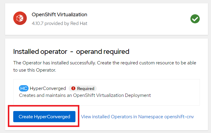 4. 설치가 완료되면, custom resource 를 생성하기 위해 Create HyperConverged를 클릭합니다.