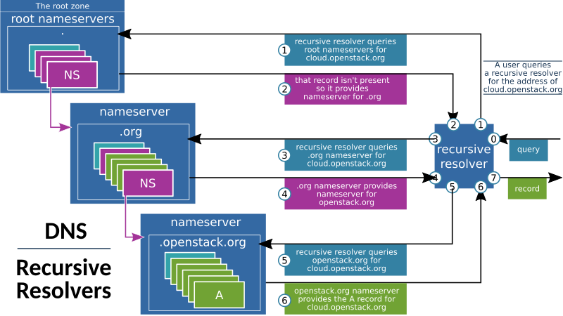 예를 들어 아래 다이어그램에서 cloud.openstack.org를 검색하면 루트 이름 서버 "."로 시작하고 ".org" 이름 서버의 위치로 응답합니다. 그러면 resolver는 ".org" 이름 서버에 접속하여 "openstack.org" 이름 서버를 얻고 거기에서 최종적으로 "cloud.openstack.org" 레코드를 가져와서 사용자에게 반환할 수 있습니다.