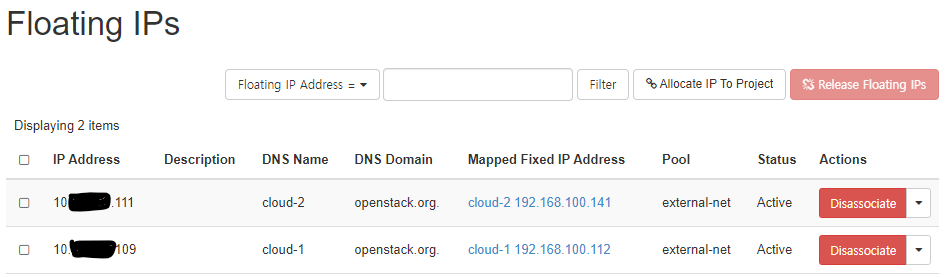 DNS와 연동이 가능한 Floating 네트워크 10.xx.xx.0/23를 생성하고 라우터를 통해 Floating 네트워크와 Tenant 네트워크를 연결해 줍니다. 다음으로는 DNS Name = cloud1/cloud2, DNS Domain openstack.org. 를 갖는 Floaing IP를 프로젝트에 할당해 줍니다.