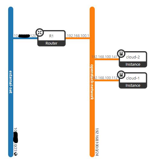 R1 라우터, openstack-network Tenant 네트워크, 외부 Floating external-net, cloud-1/cloud-2 인스턴스 간의 네트워크 토폴로지는 다음 다이어그램과 같습니다.