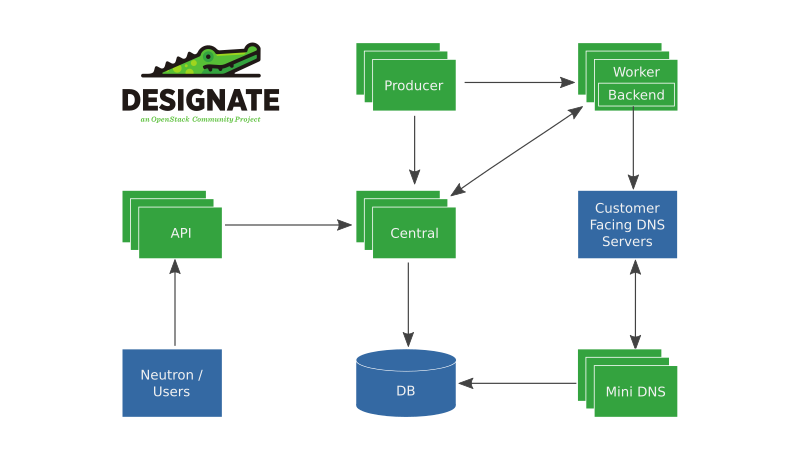 Designate는 사용자와 운영자가 REST API를 통해 DNS 레코드, names 및 zones을 관리하고 이러한 레코드를 포함하도록 기존 DNS 이름 서버를 구성할 수 있는 OpenStack 서비스입니다. 또한 Designate는 운영자가 OpenStack 네트워크 서비스(Neutron) 및 Compute 서비스(Nova) 모두와 통합하도록 구성할 수 있으므로 Floating IP 및 컴퓨팅 인스턴스가 각각 생성될 때 레코드가 자동으로 생성되고 OpenStack Identity 서비스(Keystone)를 사용합니다. 사용자 관리를 위해. DNS 이름 서버의 소프트웨어 구현이 많기 때문에 Designate에는 BIND9 및 PowerDNS와 같이 많은 것을 관리하도록 구성할 수 있는 플러그형 백엔드가 있습니다.