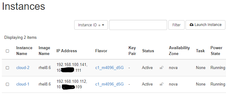 cloud-1, cloud-2 이름의 인스턴스를 생성하고 앞서 생성한 Floating IP를 연결해 줍니다.