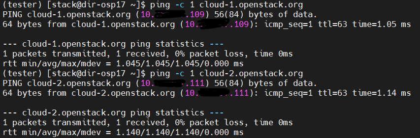마지막으로, DNS에 등록된 도메인 네임(cloud-1.openstack.org, cloud-2.openstack.org)에 Ping을 통해 네트워크 연결을 검증하겠습니다.