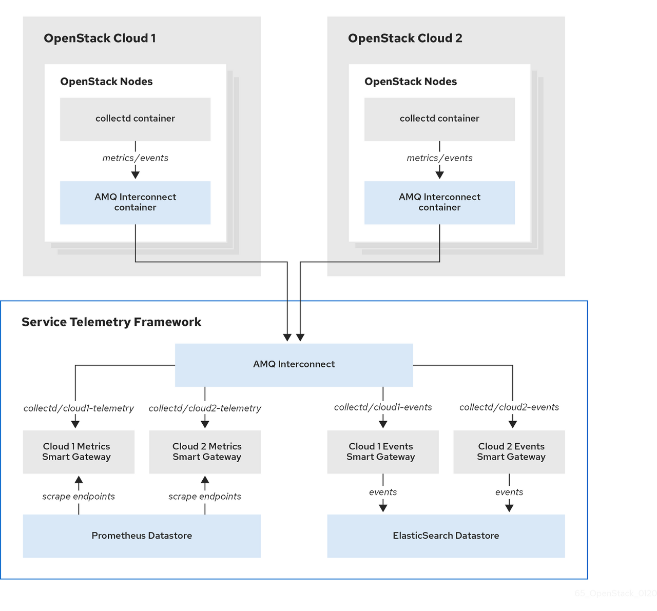 The following diagram shows multiple Red Hat OpenStack Platform clouds that are monitored and collected by one STF(Service Telemetry Framework)