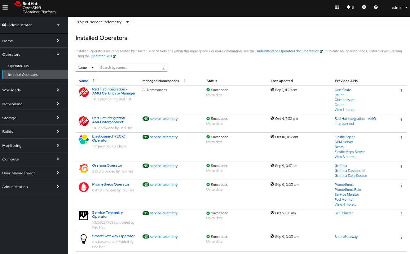 Administrators can use operators to run STF core components and objects on OpenShift. The following OpenShift dashboard console shows the installed Operators.